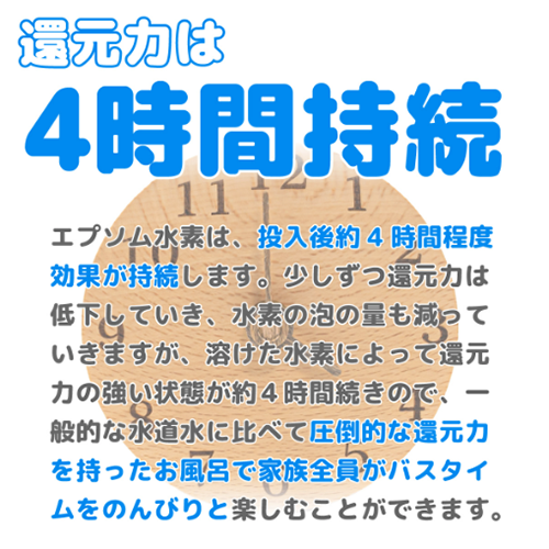 さらにエプソム水素は、投入するだけで水道水に含まれる残留塩素を瞬時に0にします。