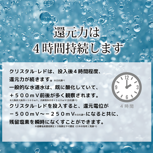 さらにクリスタルレドは、投入するだけで水道水に含まれる残留塩素を瞬時に0にします。