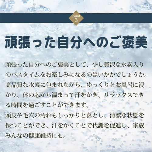 だからこそ、水素がたっぷり溶け込んだお風呂に入ることで、1日の疲れをやさしくリセットする入浴習慣がおすすめです。