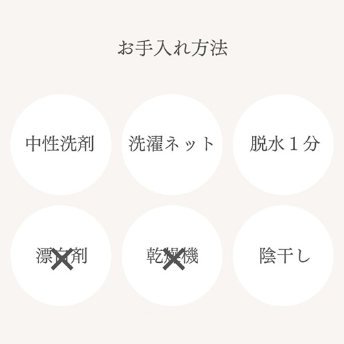 洗濯機をご使用の際は必ずネットに入れ、手洗いコース、ドライコースなど優しくケアできるコースを選び、脱水は1分以内で行ってください。また、タンブラー乾燥は使用しないでください。