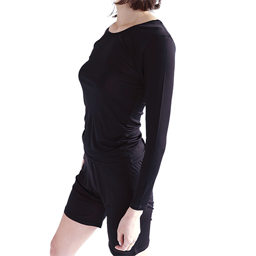 シルクのなめらかさを最大に活すためハイゲージのスムース編みで仕立てた薄手の生地は、締め付けない、付かず離れずストレスフリーな着心地と軽さが特徴です。