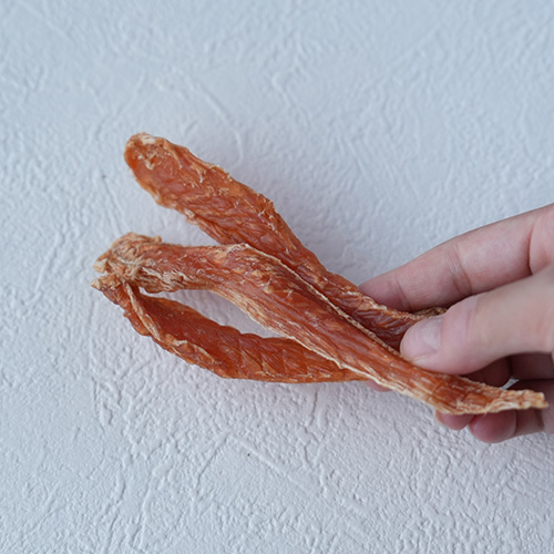 この貴重なささみを、スタッフが一本ずつ手切りでスライスし、低温でじっくりジャーキーに。