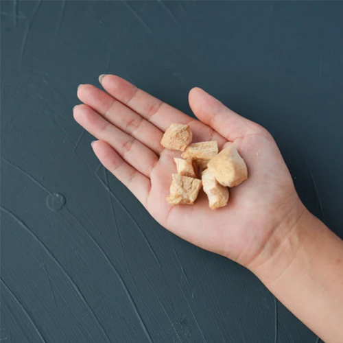 その鶏むね肉の皮を丁寧に取り除いた上で、手作業でカットし、約100時間かけてフリーズドライ加工。