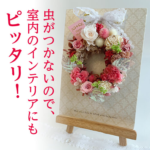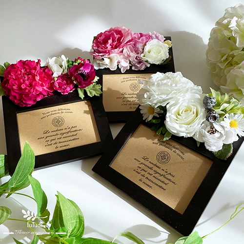 フラワーアレンジメントのついた、おしゃれなフォトフレームです。アーティフィシャルフラワー(高品質な造花)を使用しておりますので、数年単位の長期にわたってお楽しみいただけます。