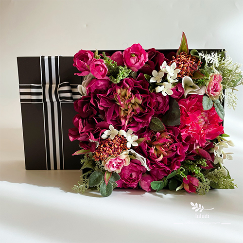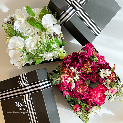ギフトに人気のボックスタイプです。アーティフィシャルフラワー(高品質な造花)を使用しているので数年単位にわたってお楽しみいただけます。