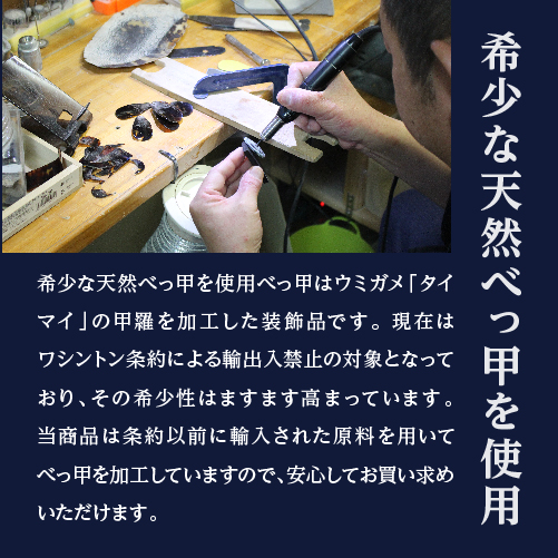 1992年よりべっ甲の原料となる天然の亀の一種、タイマイの甲羅の国際的な輸出入が禁止され、本物の天然べっ甲製品は希少な高級品として入手困難になりました。べっ甲風のプラスチック製品などが数多くある中、当店では本物のタイマイのべっ甲をつかった、希少性の高い本当のべっ甲商品を取り扱っております。取り扱う原料は、ワシントン条約締結の1992年以前に輸入した正規のタイマイの甲羅「べっ甲」です。