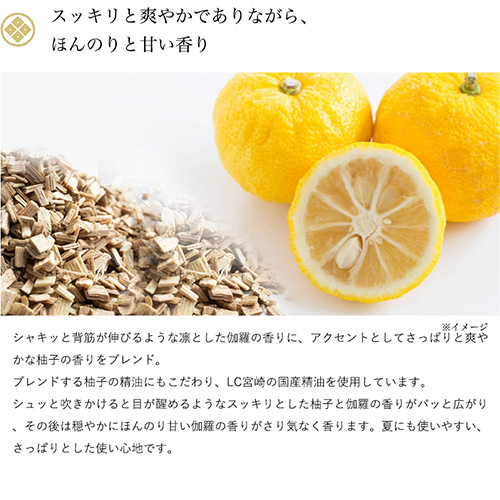| 成分 | 水、エタノール*、ユズ果皮油*、ポリソルベート 20、ジンコウ木油、PEG-40 水添ヒマシ油、ヒドロキシプロピルシクロデキストリン、カプリル酸グリセル、PEG-60 水添ヒマシ油、フェノキシエタノール *オーガニック原料使用 |