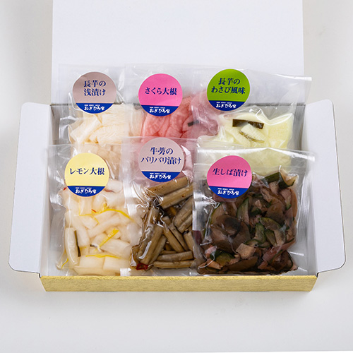 おぎひろ家の無添加・無着色・減塩の体が喜ぶ美味しい京風漬物6種セットです。お好みで6種のお漬物をお選びいただけます。おぎひろ家自慢の、自家製出汁をきかせて素材の味を大事にした、風味豊かなお漬物をお楽しみください。