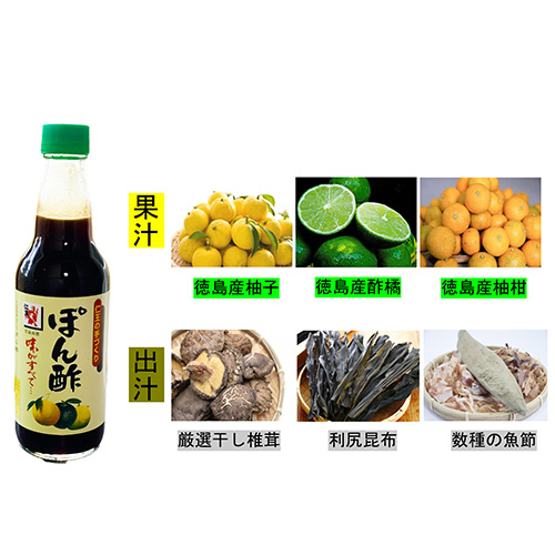 | 原材料 | 本醸造しょうゆ、かつおぶし、利尻こんぶ、乾しいたけ、スダチ、ユコウ、ユズ、砂糖 、みりん、食塩、 調味料(アミノ酸等)、酸味料、カラメル色素 |