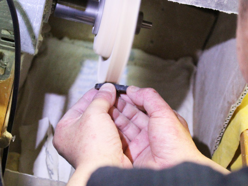 続く磨きの作業は、研磨剤と、「バフ」と呼ばれる高速回転する道具を用いて行う。