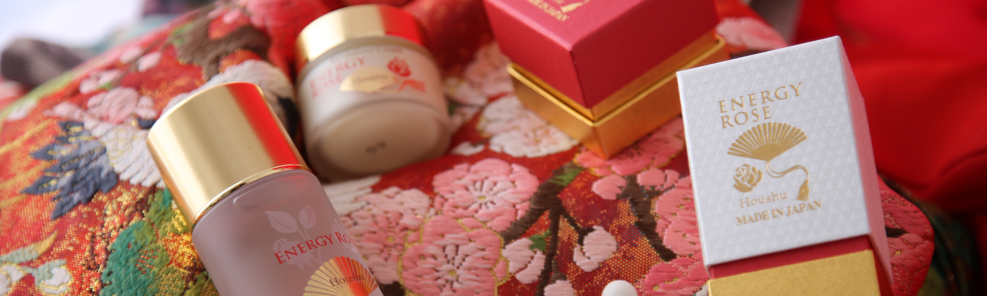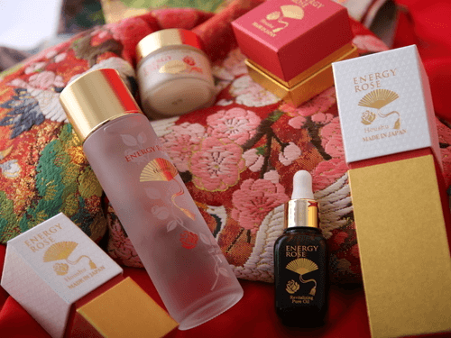 ローズと金色の扇が印象的な本体は、視覚的にも高級感をまとう。外箱は、京都の貼箱職人による手作りだ。日本の手仕事は、大量生産ではなく、一つ一つ心を込めて作られるENERGY ROSEと共鳴する。末広「すえひろがり」の扇には、使う女性の人生が末永く栄え、幸福になるようにという願いを込めた。