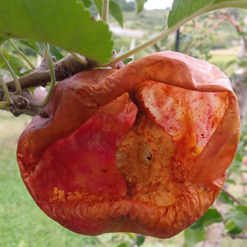 蜂がりんごの実だけを食べて、皮と芯だけ残っている様子