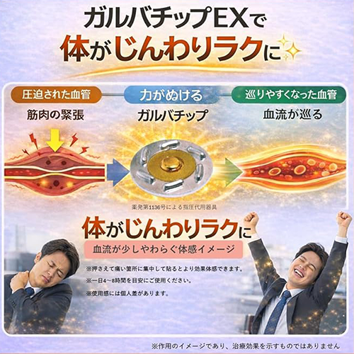 仕事や家事、育児に追われる現代人にとって、定期的に鍼灸院や整骨院へ通い続ける時間を捻出するのは容易なことではありません。そんな忙しい日常の合間に、自宅でプロ級のケアを叶えてくれるのがガルバチップの大きな魅力です。わずかコイン1枚ほどの大きさながら、ツボを刺激して筋肉のコリをほぐし、血行を促進。通院の手間をかけず、日常生活の中で体本来の巡りを整え、日々の疲れをリセットしてくれる、現代人のための新しいセルフケア習慣です。