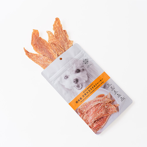 食べ応え満点のボリューム感があるのが、『まるごと鶏ささみジャーキー』。熊本県産の地鶏『天草大王』のささみを丸々使い、うま味を凝縮した仕上がりとなっている。「ブロイラーのような臭みやクセがないから、ワンちゃんの食いつきもバツグンですよ」(渡邉征希さん)。