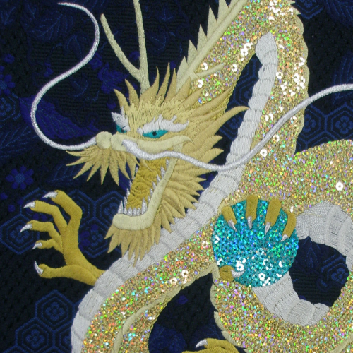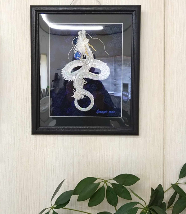 「私たちの技術の集大成ともいえるのが、このemonyaでお届けする龍神と七福神の刺繍アートです。商品が完成するまでにはかなりの試行錯誤を行いました。」言うまでもなく、そのモチーフを刺繍で表現するのは至難の業だ。例えば龍神。顔の表情、目の光を表現する一縫いだけで、その刺繍に命を宿らせることができるかどうかを左右する。糸の太さ、色、縫う方向など、何度も何度も繰り返し調整した。また龍神の体のデザインや動き、煌めくスパンコールの配置の仕方で、今にも動きだしそうな深みのある模様を作り上げるのにも苦労した。