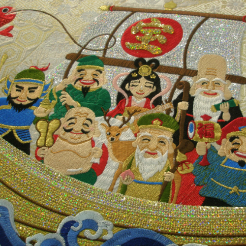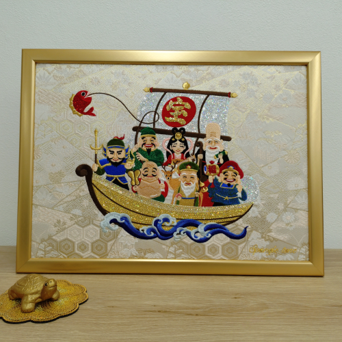 スパンコールをちりばめた煌びやかな刺繍が映えるスパングルトーン®の開運アート。健康や長寿、勝負運の向上、金運や縁結びなど多くのご利益があるとされる龍神や七福神をモチーフに、京都で継承される緻密な刺繍技術で織り上げました。ご利益のある開運アートはお祝い事や贈り物に喜ばれる一品です。