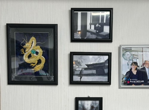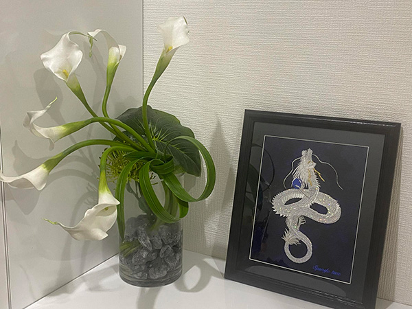 京都の刺繍は「京繍(きょうぬい)」と呼ばれ、細かく繊細な縫い技術により、糸一本で毛筋一筋も表現できる。糸の太さや刺し方を変えることで立体感や陰影を巧みに表現し、絵画のような深みが出せる。さらには、金糸・銀糸の扱いに長け、煌びやかであるにも関わらず落ち着いた上品な表現ができるのも京都の刺繍屋だからこその技術だ。「会社には長年にわたり蓄積された刺繍の技術がありますし、それ自体が大きな資産なので、うまくそれを活かしていけないかな、と考えていました。」田中さんは、日本人ならではの高い技術力や、手間を惜しまない丁寧な仕上げ、アート作品としての表現力を追求することで京都の刺繍産業の技を継承しさらなる発展を目指した。