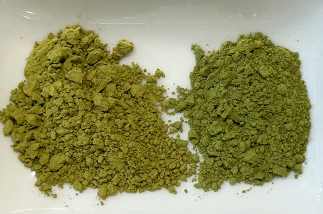 インド産の安いモリンガと今回購入した沖縄産モリンガを比べて品質の違いにびっくり。左の黄色っぽいのがインド産で、右の緑のが沖縄のモリンガです。色が全然違う。味が深い。酸化していない証拠ですね。