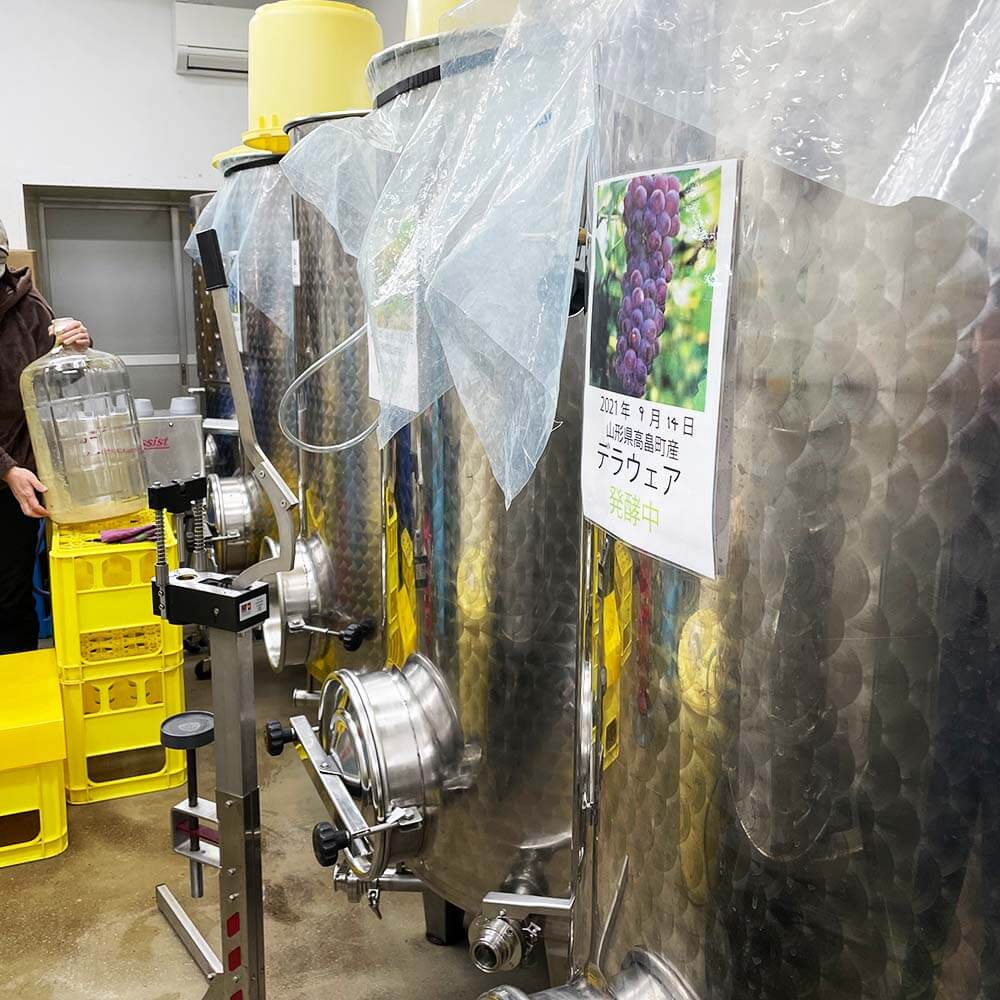 搾ったぶどうをタンクに入れて、ワインへと発酵させていく。ぶどうの状態や気候によって熟成度合いは変わるので、こまめにティスティングしながら、ワインの出来上がりを確かめる。ベストな状態になれば、タンクから手作業で瓶に詰めてリリースだ。今仕込んでいるワインがいつリリースできるかは、その時にならないとわからない。
