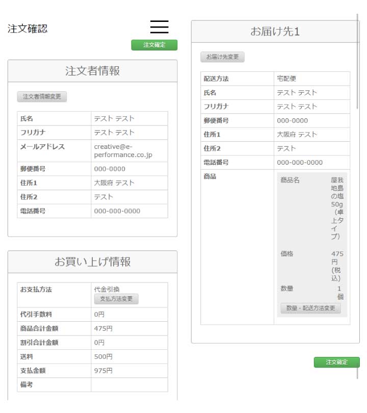 ご入力いただいた商品の種類、個数、お届け先などに誤りがないかを確認し、注文を確定します。