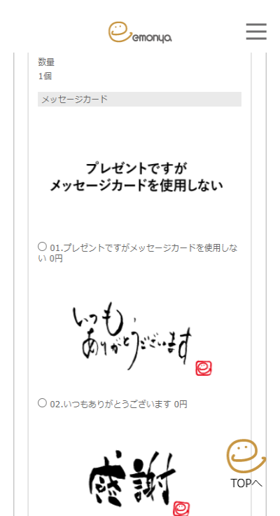ギフト設定ページで、欲しいメッセージカードを選択します。選択後、「次に進む」をクリックし注文を確定してください。