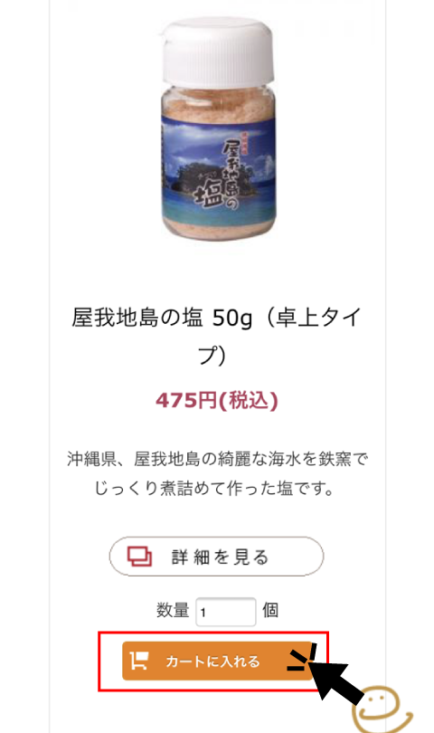 ほしい商品を見つけたら、商品写真の下部にある「カートに入れる」ボタンから個数を入力してください。