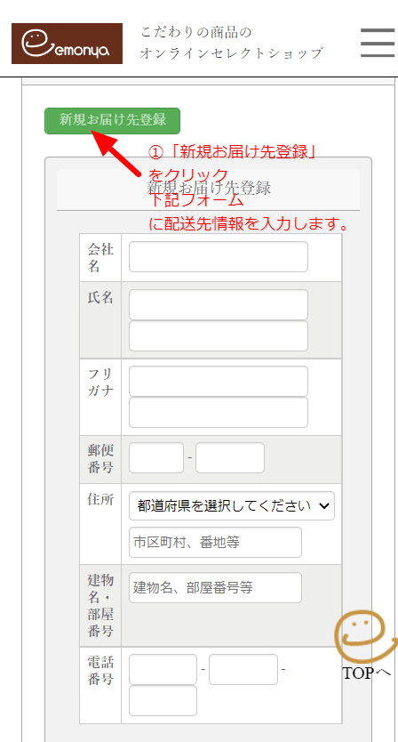 「新規お届け先登録」をクリックし、お届け先情報を入力してください。