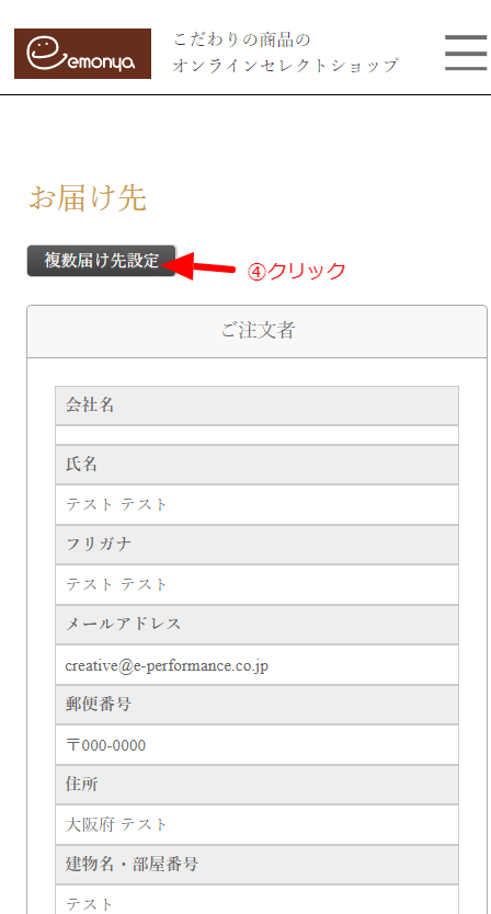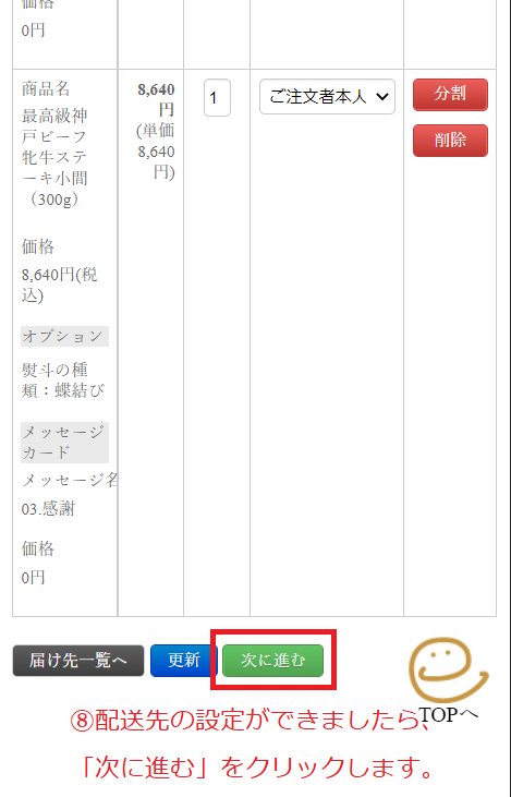 配送設定ができましたら、商品ごとにお届け先を設定します。