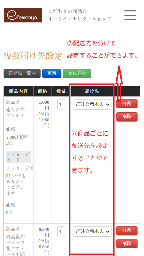 同じ商品を別々の届け先にお送られる際は、「分割」をクリックすると配送先を分けて設定することができます。