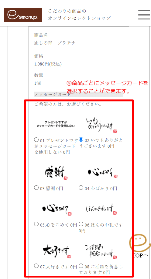 商品ごとにメッセージカードを選択することができますので、メッセージカードを選択してください。