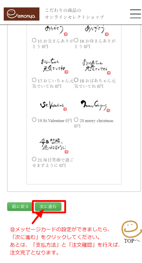 メッセージカードの選択ができましたら、「次に進む」をクリックします。